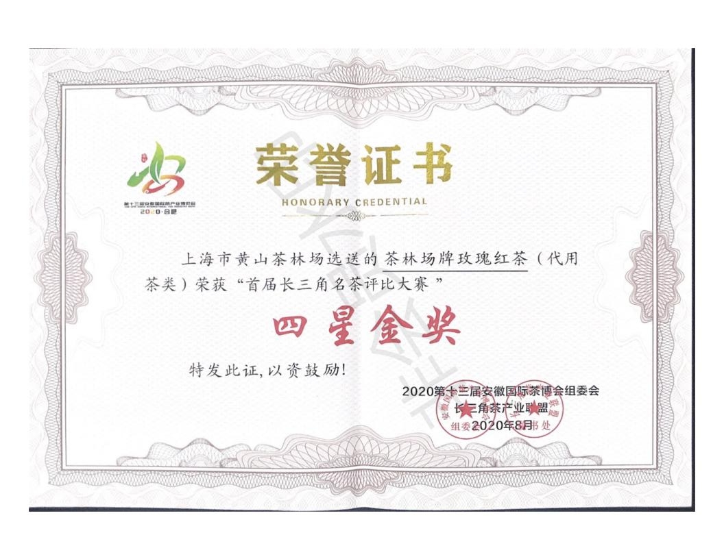上海市黃山茶林場選送的茶林場牌玫瑰花茶(代用茶類)榮獲“首屆長三角名茶評比大賽”四星金獎