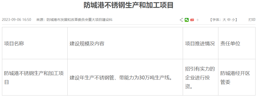 廣西防城港不銹鋼生產(chǎn)和加工項(xiàng)目主要建設(shè)年生產(chǎn)不銹鋼管、帶能力為30萬(wàn)噸生產(chǎn)線(xiàn),目前項(xiàng)目處于招引有實(shí)力的企業(yè)進(jìn)行投資階段。