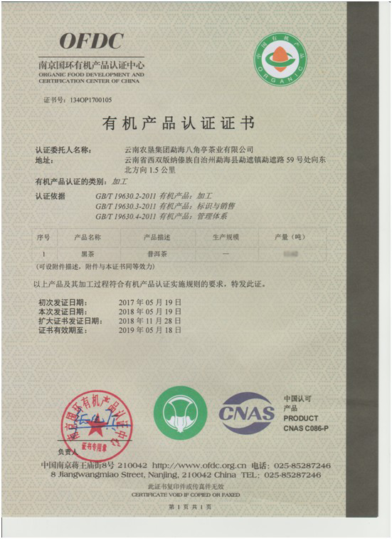云墾茶業(yè)集團(tuán)下屬茶葉生產(chǎn)企業(yè)——云南農(nóng)墾集團(tuán)勐海八角亭茶業(yè)有限公司原名黎明茶廠,是我國(guó)歷史最為悠久的茶企之一,曾位列“中國(guó)普洱茶十大知名品牌”“十大最受歡迎茶葉品牌”、“中國(guó)普洱茶十大暢銷品牌”中,成為今天市場(chǎng)上最有影響力的品牌之一。公司產(chǎn)品獲得“綠色食品”、ISO9001、 HACCP和云茶品牌(YC)4項(xiàng)認(rèn)證,連續(xù)獲得“云南名牌農(nóng)產(chǎn)品”“云南名牌產(chǎn)品”“云南省著名商標(biāo)”等品牌榮譽(yù),公司生產(chǎn)的多款普洱茶在歷次專業(yè)評(píng)比中多次獲得特等金獎(jiǎng)和金獎(jiǎng)。在2018第五屆中國(guó)企業(yè)五星品牌論壇上,云南農(nóng)墾集團(tuán)勐海八角亭茶業(yè)有限公司上榜中國(guó)普洱茶行業(yè)影響力品牌——“金芽獎(jiǎng)”,公司負(fù)責(zé)人陳勝軍先生獲“陸羽獎(jiǎng)”,被授予2017“國(guó)際十大杰出茶人”榮譽(yù)稱號(hào)。