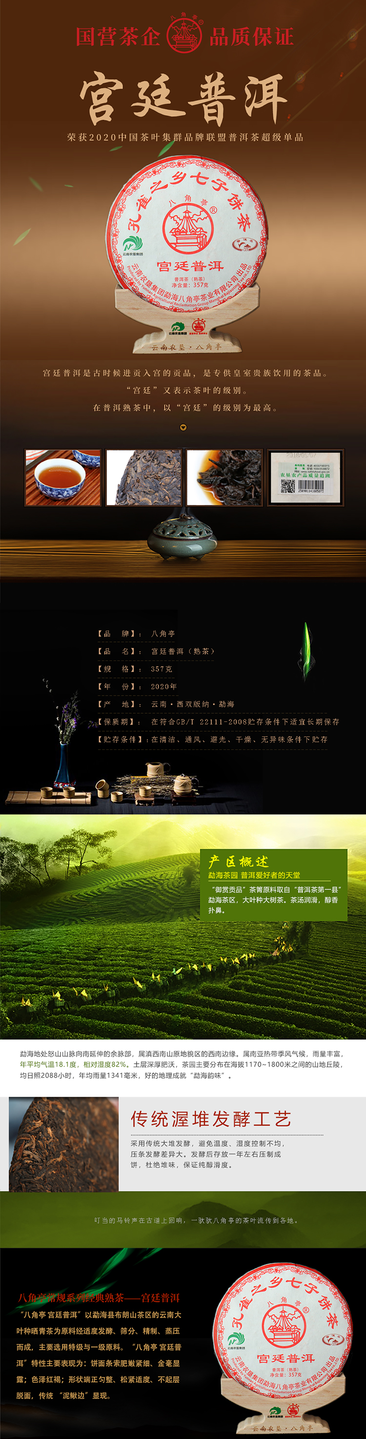 云墾茶業(yè)集團(tuán)下屬茶葉生產(chǎn)企業(yè)——云南農(nóng)墾集團(tuán)勐海八角亭茶業(yè)有限公司原名黎明茶廠,是我國(guó)歷史最為悠久的茶企之一,曾位列“中國(guó)普洱茶十大知名品牌”“十大最受歡迎茶葉品牌”、“中國(guó)普洱茶十大暢銷(xiāo)品牌”中,成為今天市場(chǎng)上最有影響力的品牌之一。公司產(chǎn)品獲得“綠色食品”、ISO9001、 HACCP和云茶品牌(YC)4項(xiàng)認(rèn)證,連續(xù)獲得“云南名牌農(nóng)產(chǎn)品”“云南名牌產(chǎn)品”“云南省著名商標(biāo)”等品牌榮譽(yù),公司生產(chǎn)的多款普洱茶在歷次專業(yè)評(píng)比中多次獲得特等金獎(jiǎng)和金獎(jiǎng)。在2018第五屆中國(guó)企業(yè)五星品牌論壇上,云南農(nóng)墾集團(tuán)勐海八角亭茶業(yè)有限公司上榜中國(guó)普洱茶行業(yè)影響力品牌——“金芽獎(jiǎng)”,公司負(fù)責(zé)人陳勝軍先生獲“陸羽獎(jiǎng)”,被授予2017“國(guó)際十大杰出茶人”榮譽(yù)稱號(hào)。
