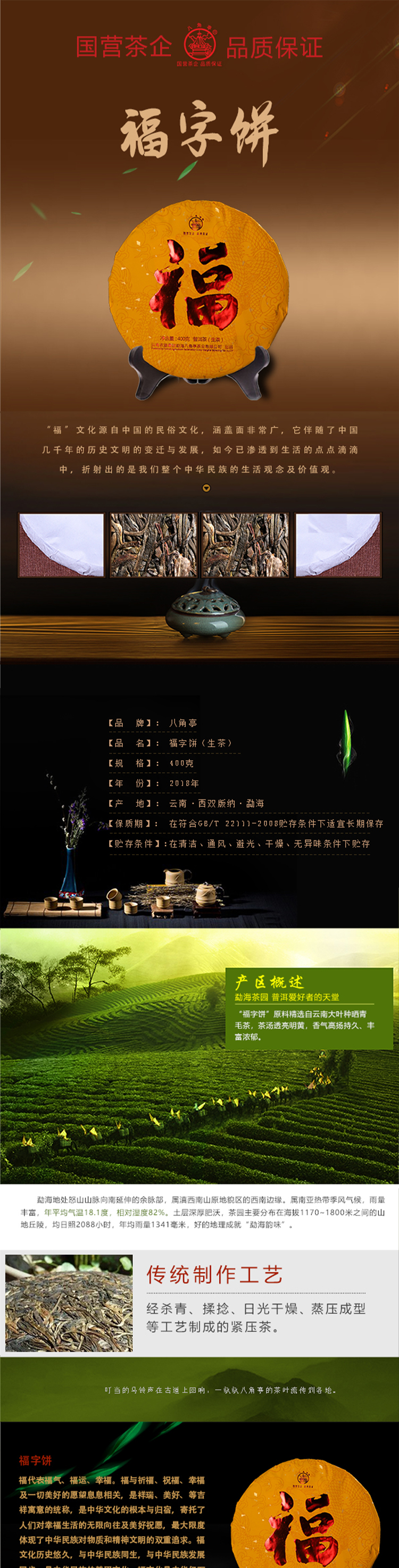 ??——八角亭茶業(yè)公司:經(jīng)營(yíng)方式為生產(chǎn)加工、銷售,主營(yíng)普洱茶、緊壓茶、兼營(yíng)毛茶收購(gòu)。目前以生產(chǎn)、加工、銷售“八角亭”系列普洱茶為主,是云南省農(nóng)業(yè)產(chǎn)業(yè)化龍頭企業(yè)。“八角亭”商標(biāo)獲得云南省著名商標(biāo),“八角亭”牌普洱茶榮獲云南省名牌產(chǎn)品和云南省名牌農(nóng)產(chǎn)品。已先后通過(guò)工業(yè)生產(chǎn)許可證、ISQ9001與HCCP認(rèn)證、云茶牌認(rèn)證(YC)等項(xiàng)工作,在歷次專業(yè)評(píng)比中“八角亭”普洱茶多次獲得特等金獎(jiǎng)和金獎(jiǎng)。2017年5月,“八角亭”牌老班章茶葉獲得了有機(jī)茶資格認(rèn)證。八角亭茶業(yè)公司多次進(jìn)行了技術(shù)改造,現(xiàn)已建立了標(biāo)準(zhǔn)化生產(chǎn)車間和設(shè)備,年設(shè)計(jì)生產(chǎn)量達(dá)3000噸,是整個(gè)公司的主體核心企業(yè)。