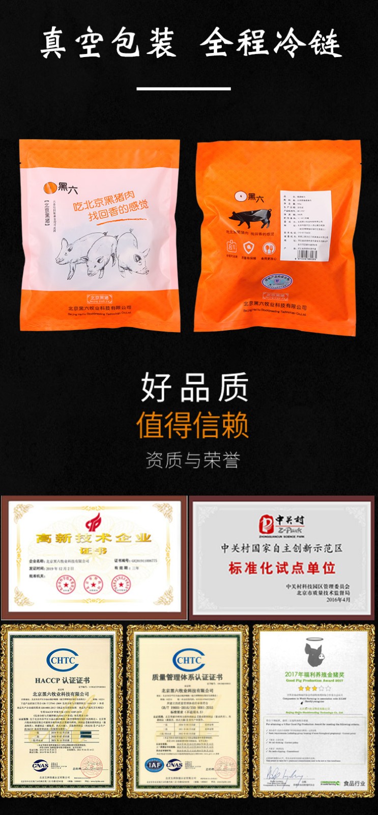 公司利用北京黑豬自有知識產(chǎn)權(quán),通過科技支撐,建立了從基地到餐桌的安全、優(yōu)質(zhì)食用農(nóng)產(chǎn)品加工的全程可追溯體系,“黑六”高品質(zhì)豬肉受到廣大消費(fèi)者關(guān)注和接受。隨著北京黑豬全產(chǎn)業(yè)鏈的延伸和發(fā)展,公司獨(dú)創(chuàng)的“黑六”品牌日益受到消費(fèi)者青睞。“黑六”產(chǎn)品通過超市專賣、直銷、電商、餐飲等渠道步入了千家萬戶。被淡忘和追尋的肉嫩味美的北京黑豬肉通過黑六團(tuán)隊(duì)的精心打造,再度成為消費(fèi)者舌尖上的享受、餐桌上的靚麗一景。