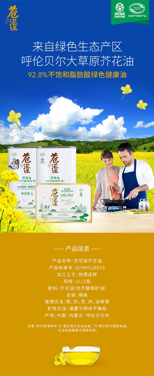 呼倫貝爾農墾出品蒼茫謠芥花油低芥酸菜籽油非轉基因1L*2禮盒